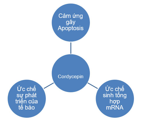Cordycepin là chất hóa học 3’- deoxyandenosine, là một chất tương tự andenosine – một nguyên liệu để phân chia tế bào nên trong quá trình phân chia tế bào, tế bào có thể nhầm lẫn giữa 2 chất trên gây nên sự ức chế quá trình phân chia. Các nghiên cứu cụ thể: