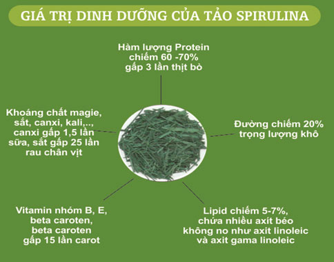 Tảo Spirulina là một loài vi khuẩn lam có kích thước nhỏ chỉ quan sát được hình thái dưới kính hiển vi, cơ thể ở dạng đơn bào. Nó là một loại sinh vật có hàm lượng dinh dưỡng cao, chứa hầu hết các loại dinh dưỡng mà con người cần như protein, lipid, gluxit, vitamin và khoáng chất,… Hiện nay, tổ chức Nông lương Liên hợp quốc (FAO) và tổ chức Y tế thế giới (WHO) đều xác định: tảo Spirulina là “thực phẩm lý tưởng” của thế kỉ 21. Nhiều nước như pháp, Mỹ, Đức, Nhật, Trung Quốc, Ấn Độ,… đã dùng tảo Spirulina chế biến thành thực phẩm bổ sung dinh dưỡng hằng ngày.